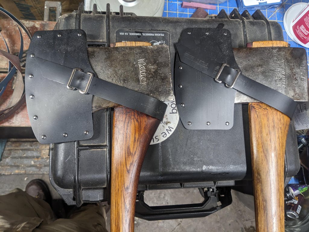 Many of us own vintage restored axes or modern made axes that either didn't come with a mask or came with one that was too flimsy to inspire confidence. Made from our tough-as-nails PetroCor™ HDPE polymer, this axe mask fits from roughly boy's axe-sized axes through even very large full-sized American-style axes and mauls. Lightweight and impervious to the elements, the mask is held together with gunmetal-finished brass rivets and a handy snap buckle that allows for snap strap-style release with a custom-sized fit. Features a slot 5-1/2" wide between the center post of the rivets. Bear in mind that thicker bits will cause this slot to narrow as it conforms to the bit. Use two snapped to one another for double bit axes!