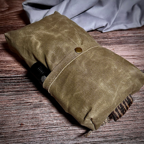 Made of our 14.1 oz waxed canvas and available in a variety of colors.  The bag measures 5" x 8" x 2".  It's light weight yet water resistant and 100% waxed cotton.  It has a large YKK zipper and cotton webbing pull tabs (color may vary).  It has a brass snap in the back external pocket.